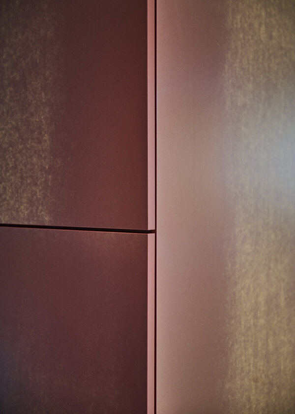 Bestens fügt sich hier die charismatische Naturfaser color ein, bei welcher jede Platte ein unterschiedliches, wolkiges Bild aufweis und somit jeweils ein Unikat ist. Im Bad wurde für den Hochschrank und den Waschtisch ein feines Eichendekor in Kombination mit der Holzstruktur Madera gewählt.