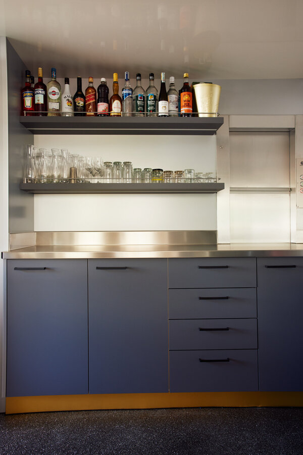 Langlebig: An der Theke sowie in der Küche der MS Wädenswil wurden HPL-Fronten von Argolite mit der samtweichen Anti-Fingerprint-Oberflächenstruktur Strato soft verbaut. Edel: Auch für die Tische wurden HPL-Platten eingesetzt, die sowohl im Innen- wie im Aussenbereich zum Einsatz kommen.